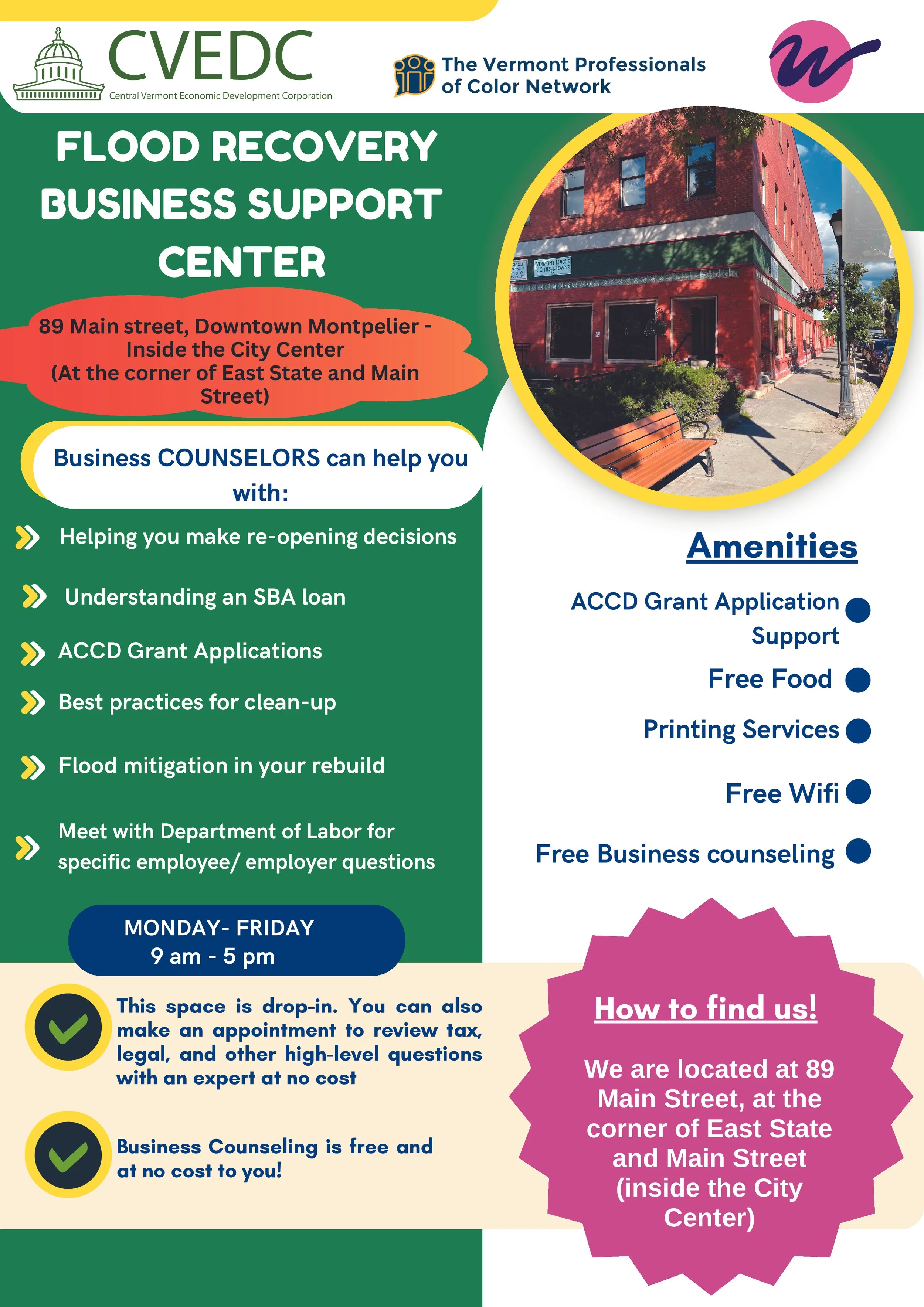 Please visit us at 89 Main St Montpelier for in-person, flood-related business assistance (Monday-Friday, 9-5). We are available to help with grant and loan applications, understanding resources, and navigating next steps.